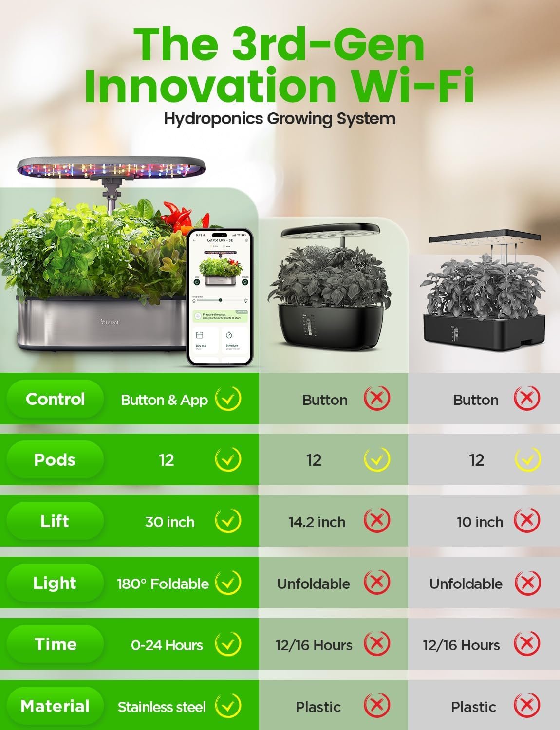 The LetPot LPH‑SE Smart 12‑Pod Hydroponic Growing System is the perfect solution for anyone looking to enjoy fresh, home-grown herbs, vegetables, and flowers all year round. Designed for convenience and efficiency, this smart hydroponic system features a 24 W full-spectrum LED grow light that mimics natural sunlight, ensuring faster and healthier plant growth. With its 12‑pod capacity, you can grow multiple plants simultaneously, making it ideal for small apartments, kitchens, or offices.